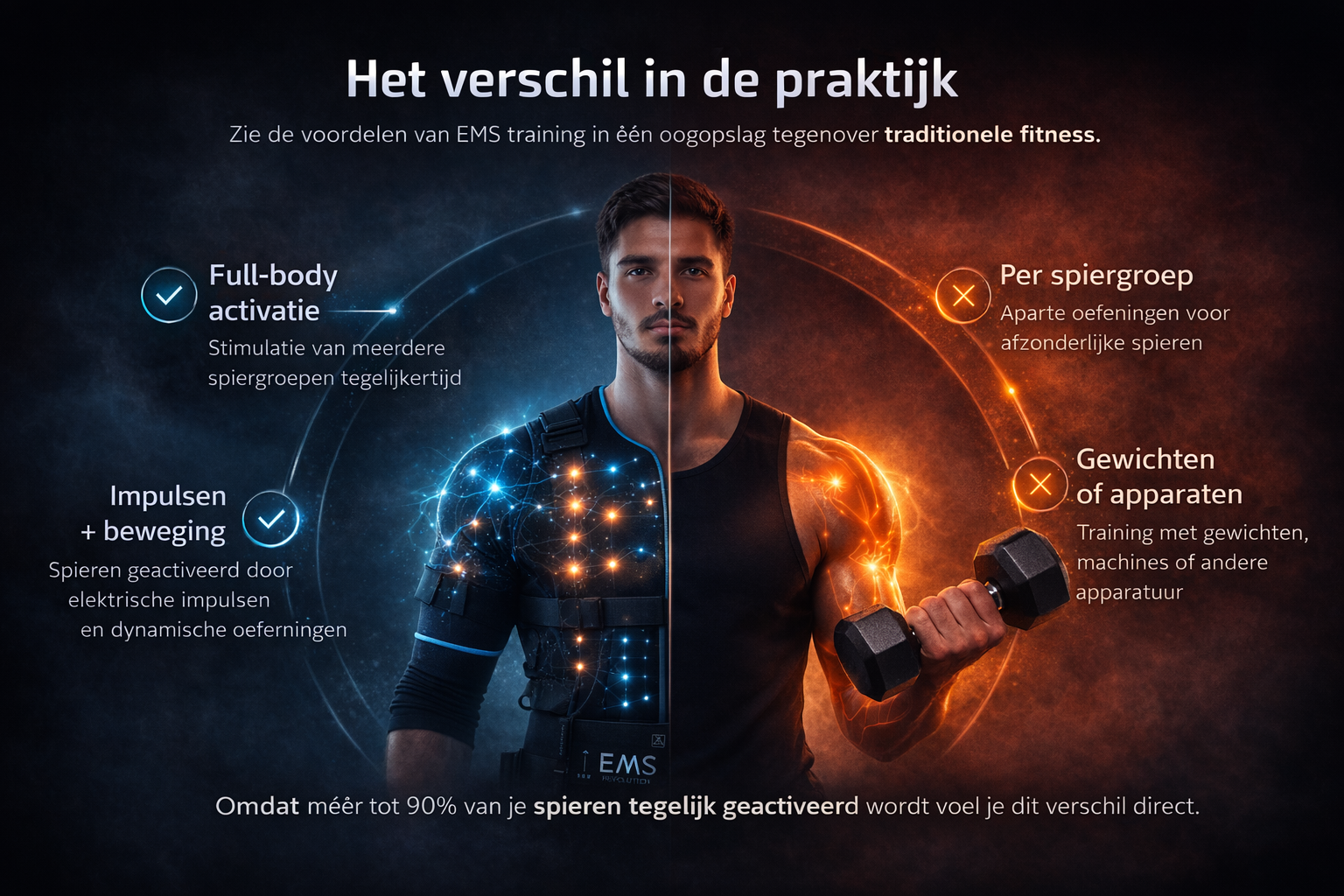 Bij EMS ligt de nadruk op aansturing via impulsen. Je beweegt zonder zware gewichten, terwijl je lichaam wél intensief werkt. De focus ligt op contractie, niet op het verplaatsen van gewicht.